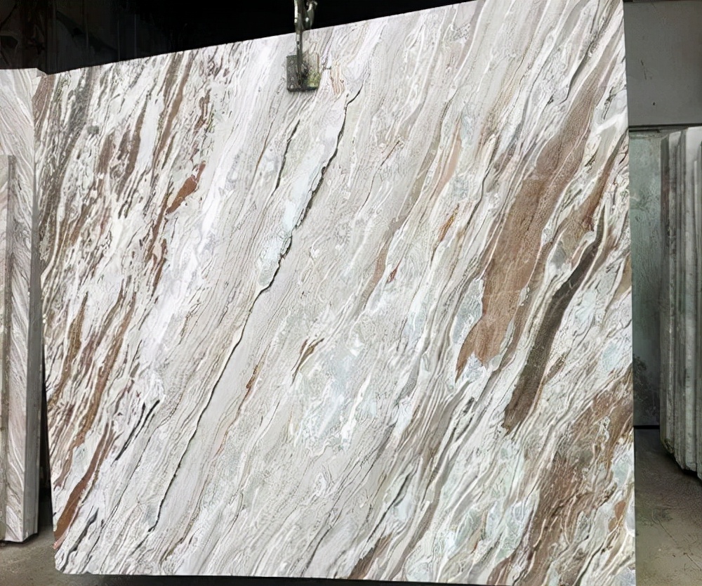 我们在石材场挑大理石时,都是看到像这样一大片的石材大样。石材依照色系、种类排列,挑选时要考虑纹路的整体性,而纹路颗粒越细致,代表质量越佳。